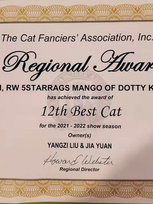 2022 Southwest 3th best Longhair Cat of the Year in TICA.